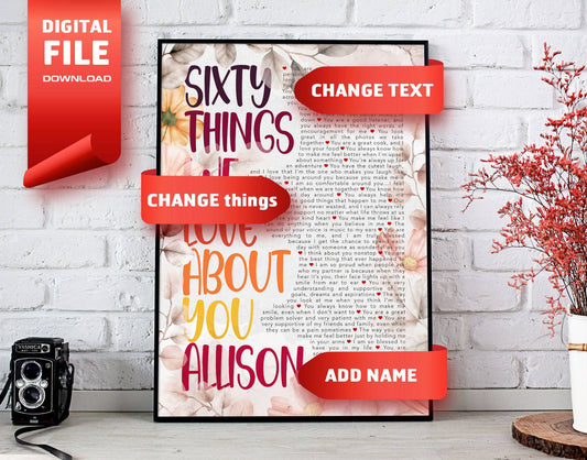 Sixty Things We Love About You - 60th Birthday gift for women - Personalized Name and things text - Digital Canvas Print File