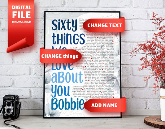 Sixty Things We Love About You - 60th Birthday gift for men - Digital Canvas Print File