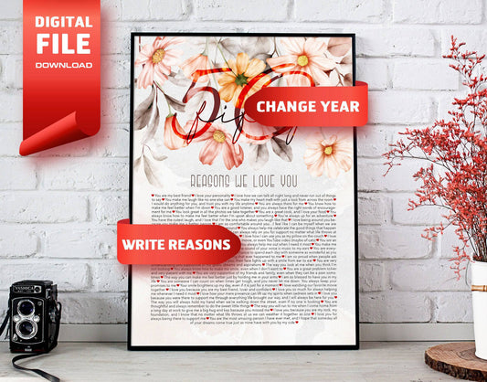 Fifty Things We Love About You, 50th birthday gift for Women - Digital Canvas Print File