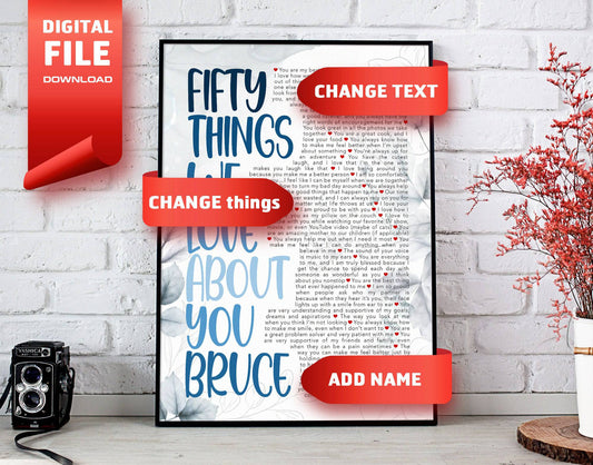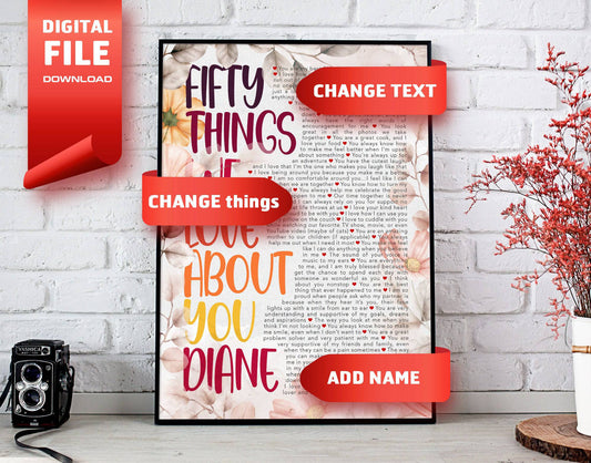 Fifty Things We Love About You, Personalized Name and Things Text Digital Canvas Print File