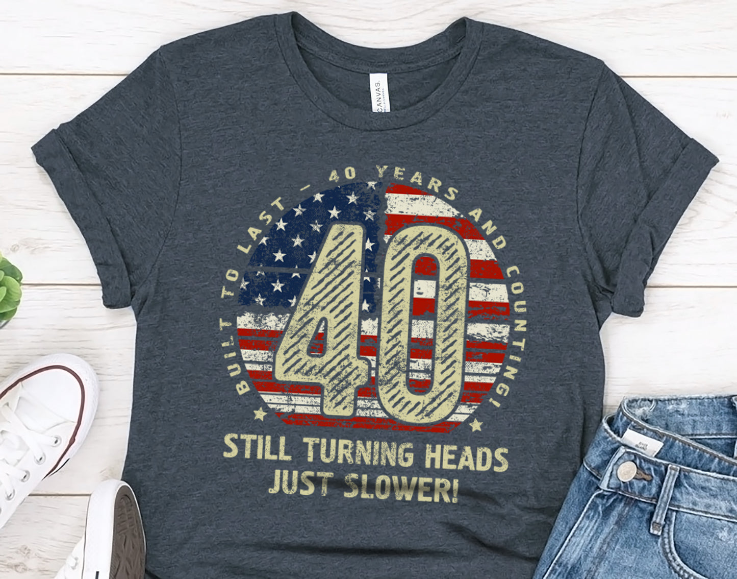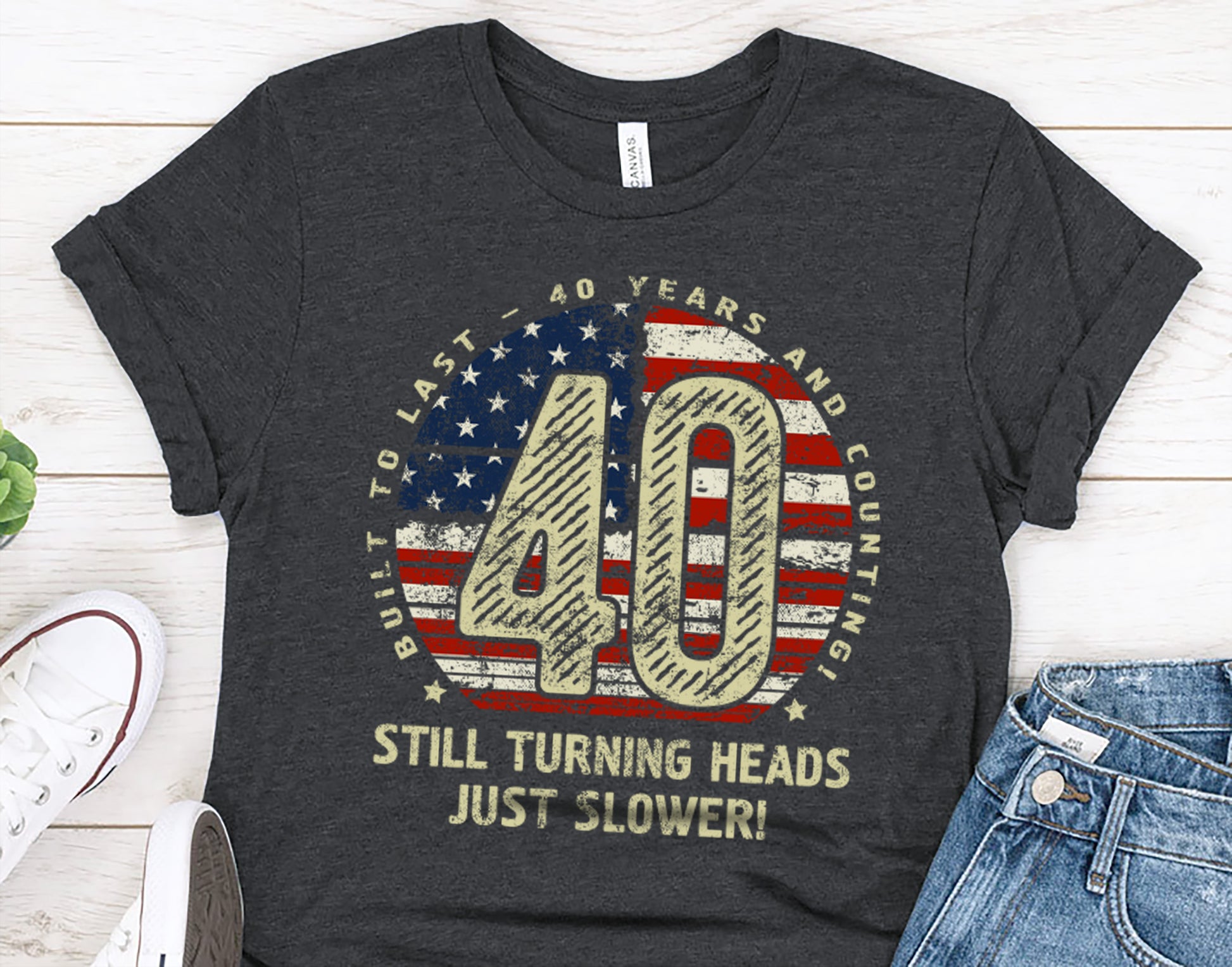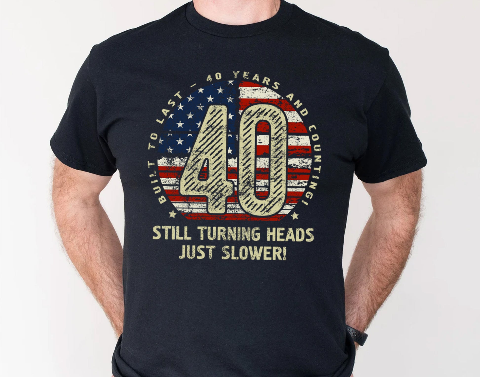 Celebrate 40 incredible years with this stylish and comfortable 40th Birthday Gift T-Shirt for Husband or Wife! Featuring a bold “40” design with a vintage American flag texture, surrounded by the phrase “Built to last - 40 years and counting,” this t-shirt is perfect for milestone birthdays. The humorous touch, “Still turning heads, just slower!” adds personality, making it an ideal gift for anyone turning 40. Crafted for comfort and durability, it’s the perfect addition to any casual wardrobe. Whether it’s a birthday celebration, a family gathering, or just lounging in style, this 40th Birthday Gift T-Shirt for Husband or Wife is sure to impress!