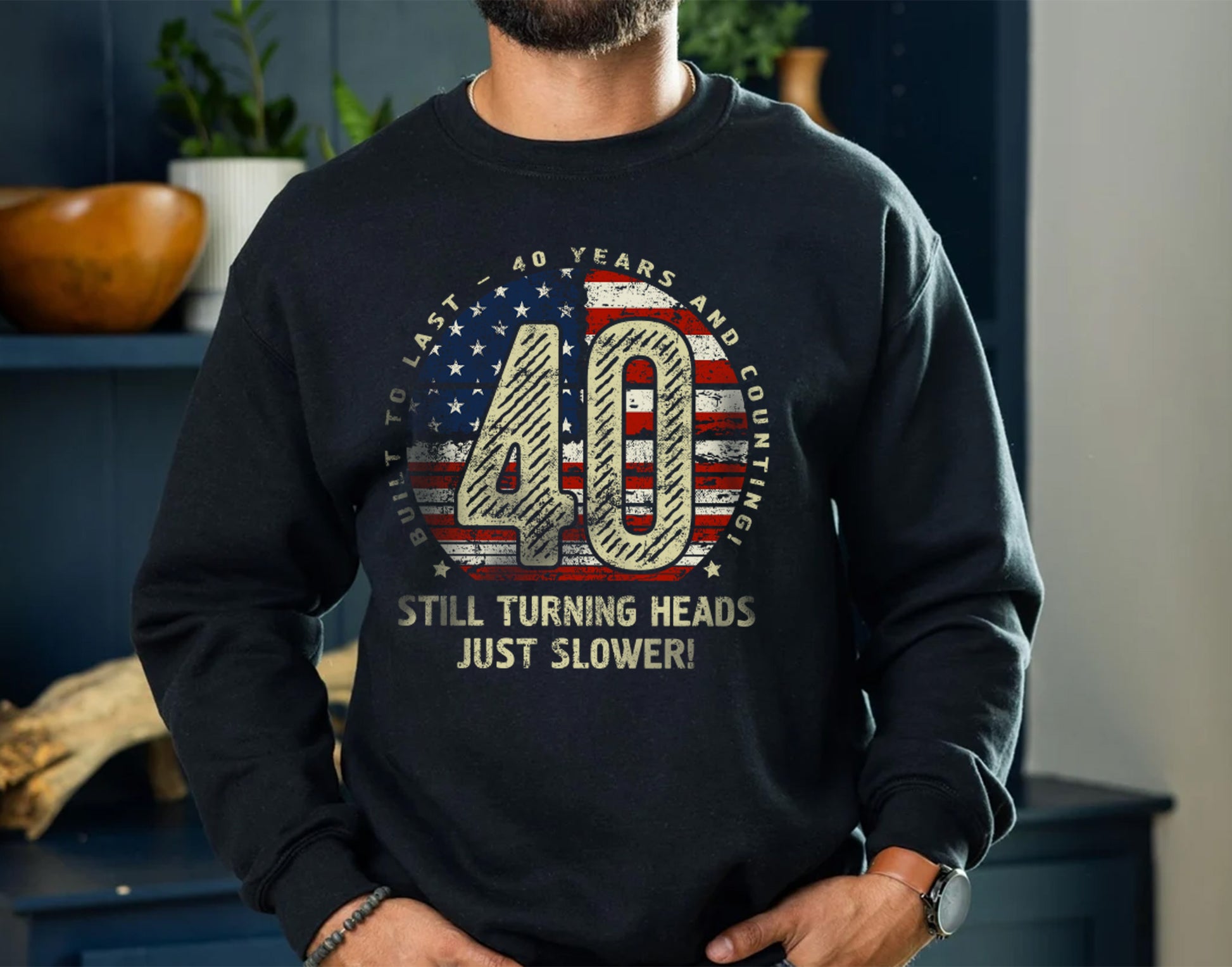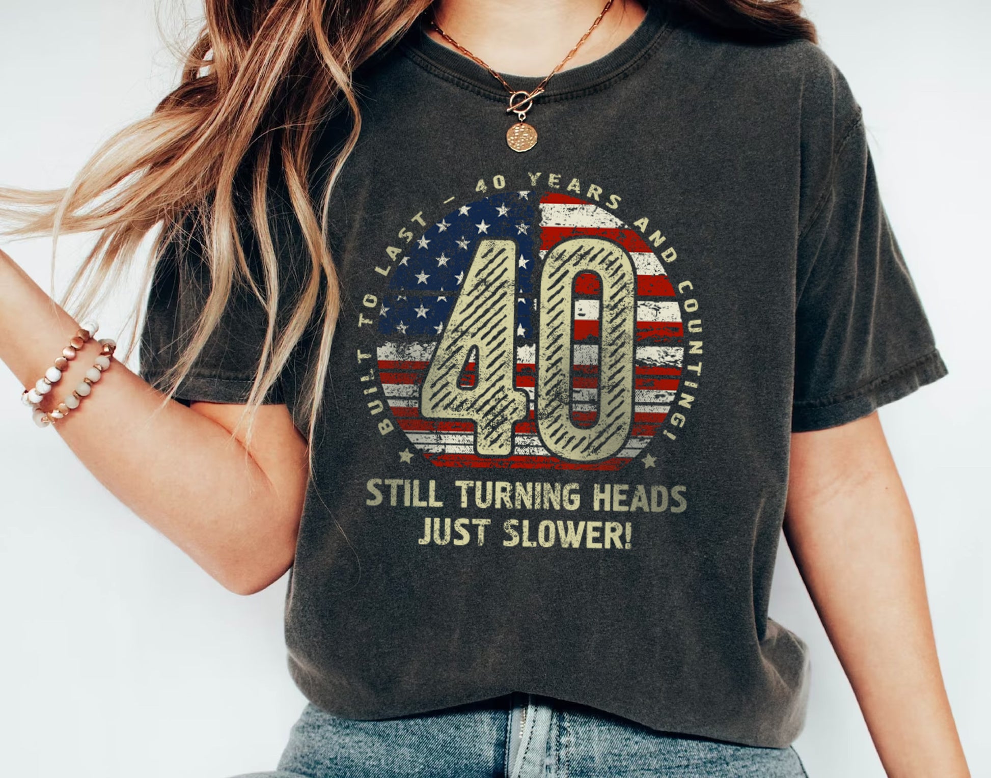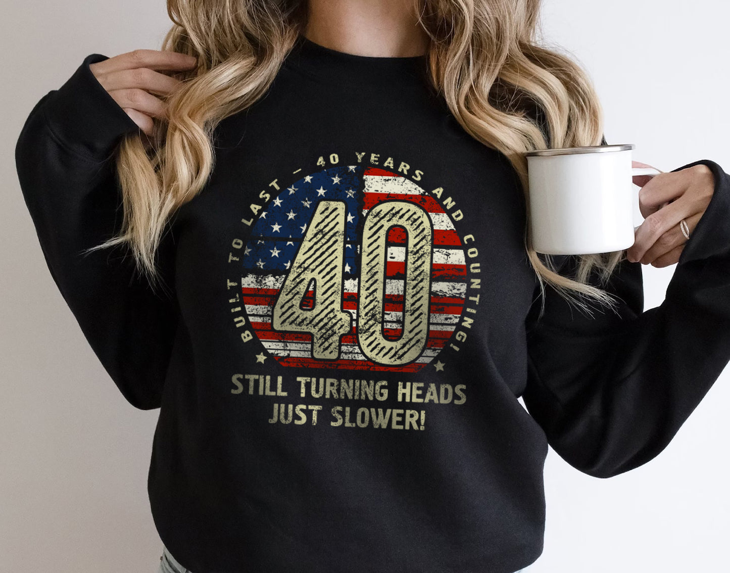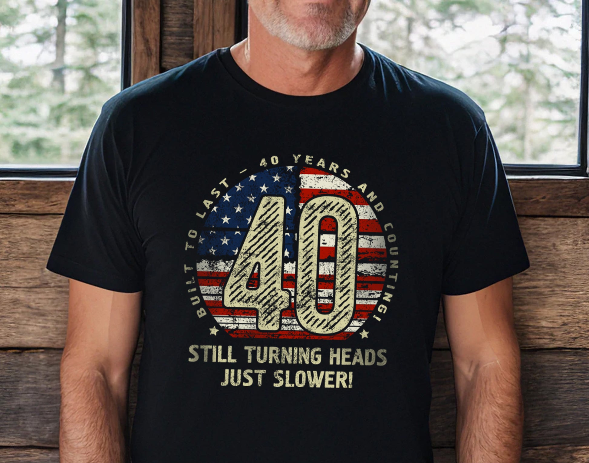Celebrate 40 incredible years with this stylish and comfortable 40th Birthday Gift T-Shirt for Husband or Wife! Featuring a bold “40” design with a vintage American flag texture, surrounded by the phrase “Built to last - 40 years and counting,” this t-shirt is perfect for milestone birthdays. The humorous touch, “Still turning heads, just slower!” adds personality, making it an ideal gift for anyone turning 40. Crafted for comfort and durability, it’s the perfect addition to any casual wardrobe. Whether it’s a birthday celebration, a family gathering, or just lounging in style, this 40th Birthday Gift T-Shirt for Husband or Wife is sure to impress!