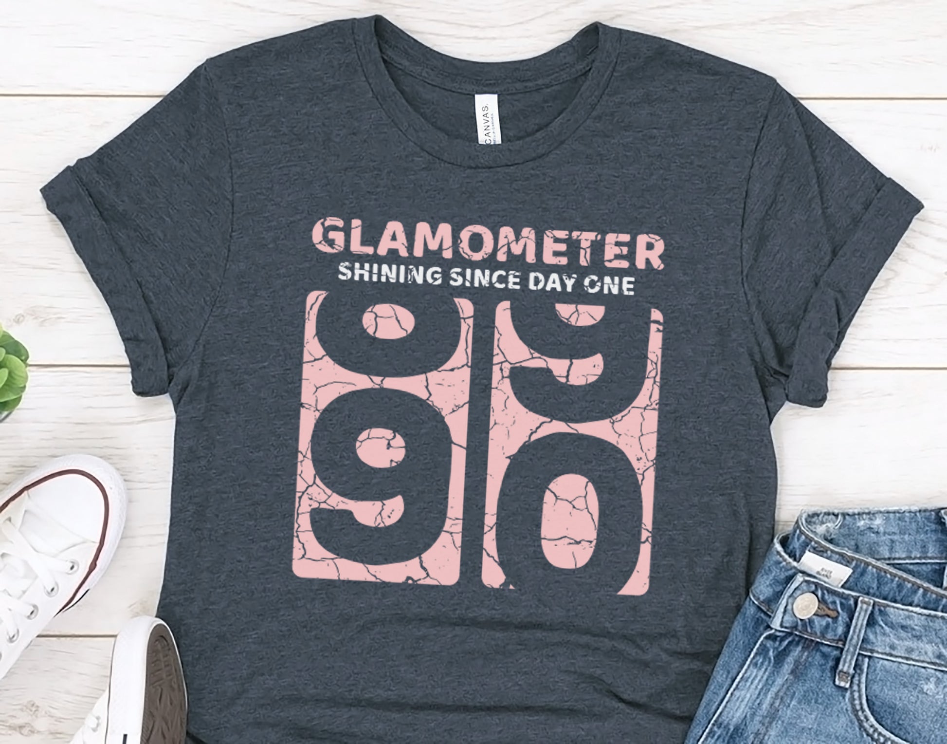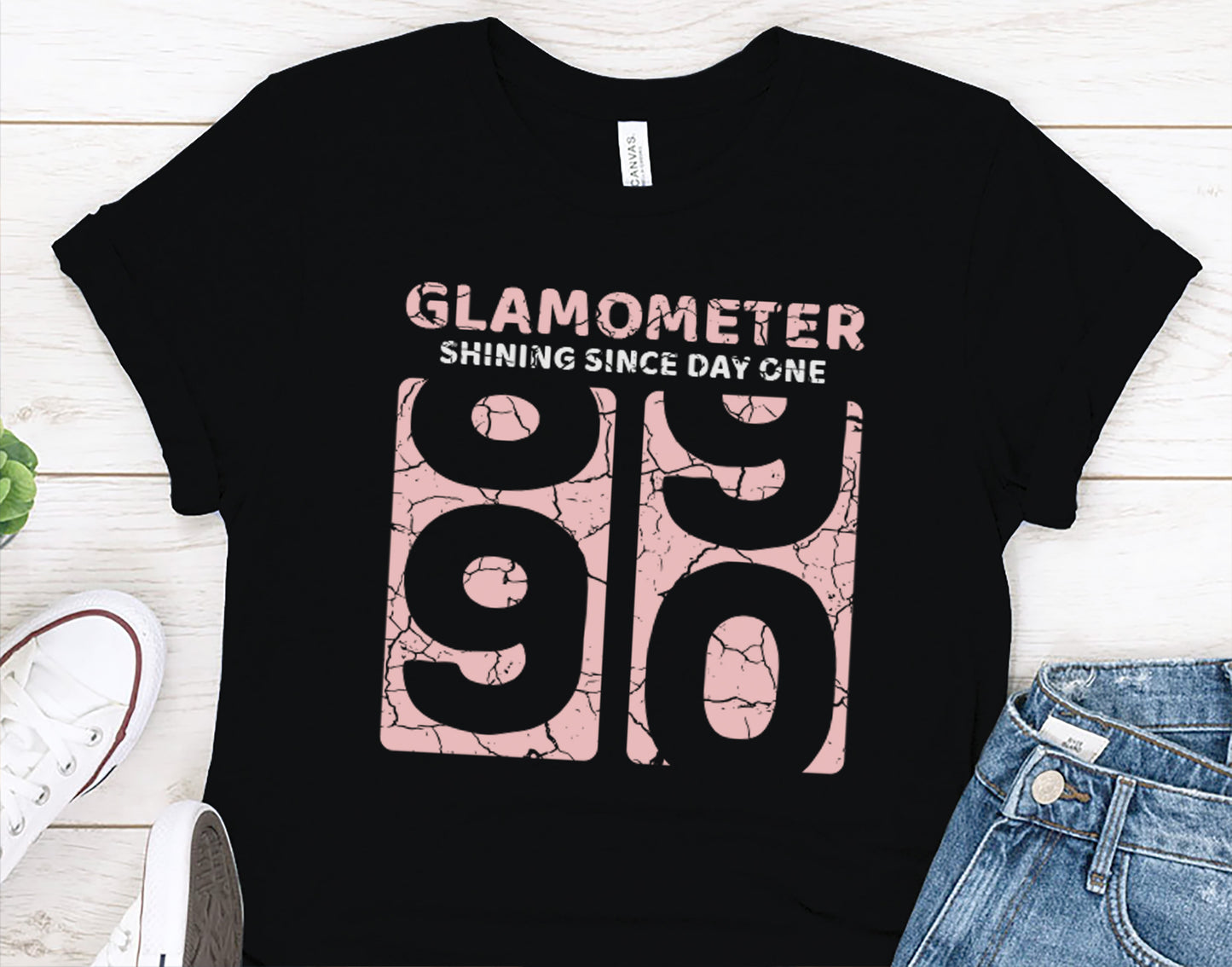 Celebrate your 90th birthday in style with our Glamometer 90th Birthday Gift Shirt for Women! This trendy and vintage-inspired tee is perfect for women who want to shine and embrace their milestone birthday with confidence. The retro cracked design with a bold “90” adds a stylish touch, while the phrase “Shining Since Day One” makes it clear – you’ve been fabulous from the start!